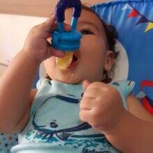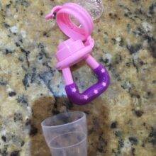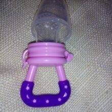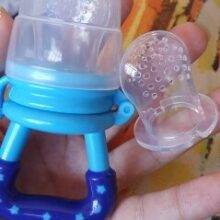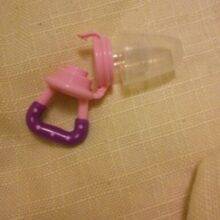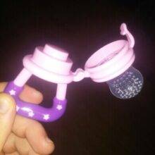 Got this for my 5 month old who just started trying food and has been teething since 3 months with no progress. I used the smallest one with frozen blueberries and she loved it. She can hold it herself with little help and I love that it can be cleaned very easily. We had a mesh feeder and tossed it because it is so hard to clean really well and just gets floppy and gross when the food thaws. This is a much better alternative and great price. My only concern is that the nipple piece can be removed too easily but hasn’t caused any issues yet.